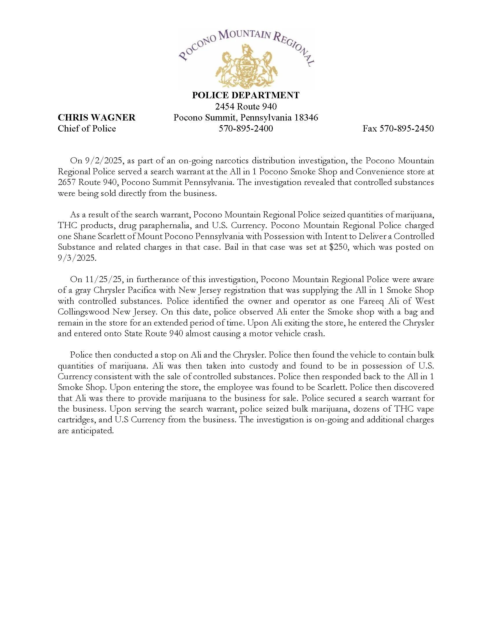 PRESS RELEASE 11.26.2025 - CONTROLLED SUBSTANCES SOLD AT LOCAL SMOKE SHOP Nov 26 Written By MaryEllen Sands-Drost MaryEllen Sands-Drost